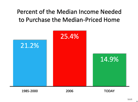 5. Houses aren’t becoming too expensive to buy. The affordability formula has three components: the price of the home, the wages earned by the purchaser, and the mortgage rate available at the time. Fifteen years ago, prices were high, wages were low, and mortgage rates were over 6%. Today, prices are still high. Wages, however, have increased, and the mortgage rate is about 3%. That means the average homeowner pays less of their monthly income toward their mortgage payment than they did back then. Here’s a chart showing that difference: