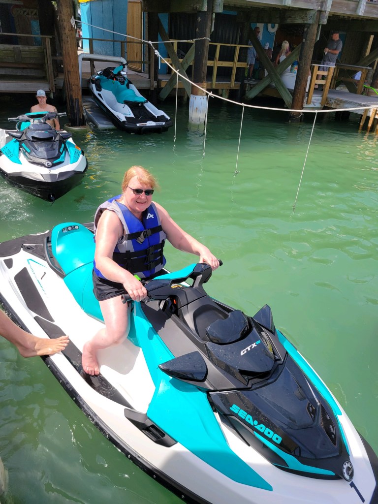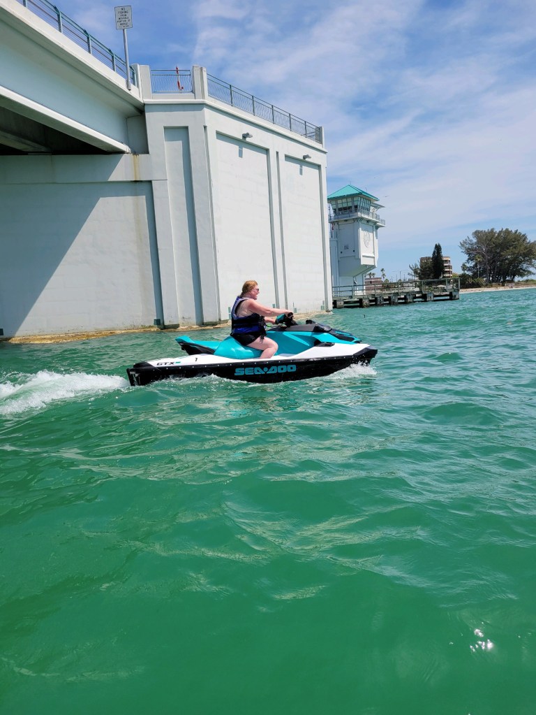 The place near us was fully booked so we expanded our search and went to Madera Beach. We were all picturing nice calm waters and a fun day in the sun. As we are listening to the employee go over instructions on how to operate it, how to flip it back over, and safety rules, we heard for the first time we were not jet skiing near the beach but in the GULF OF MEXICO. Waters for the first block were calm, we went by some dolphins and then we entered the Gulf. The ocean swells were 3 feet and sometimes a swell would break, and the water would go over your head. Jet skis surrounded us, who were gunning it and looking like they were “popping a wheelie.” My sole focus was on not running into anyone else, staying upright and alive. After awhile I noticed I could not see my companions any longer. Too afraid to turn around I decided to head back. The salt water had dried on my glasses making it almost impossible to see. So much so that I missed the bridge that I was supposed to turn at. Jamie and Tricia made it back to our starting point, but I was lost at sea.