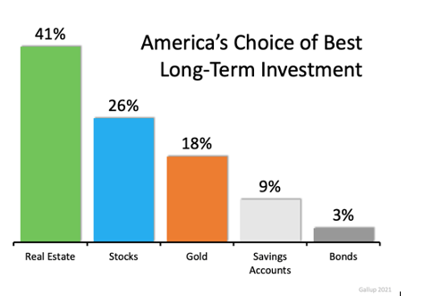 “Gallup usually finds that Americans regard real estate as the best long-term investment among several options — seeing it as superior to stocks, gold, savings accounts and bonds. This year, 41% choose real estate as the best investment, up from 35% a year ago, with stocks a distant second.”
