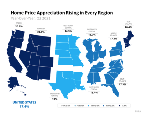 Every region in the country is experiencing at least a 14.9% increase in home price appreciation, according to the Federal Housing Finance Agency (FHFA):