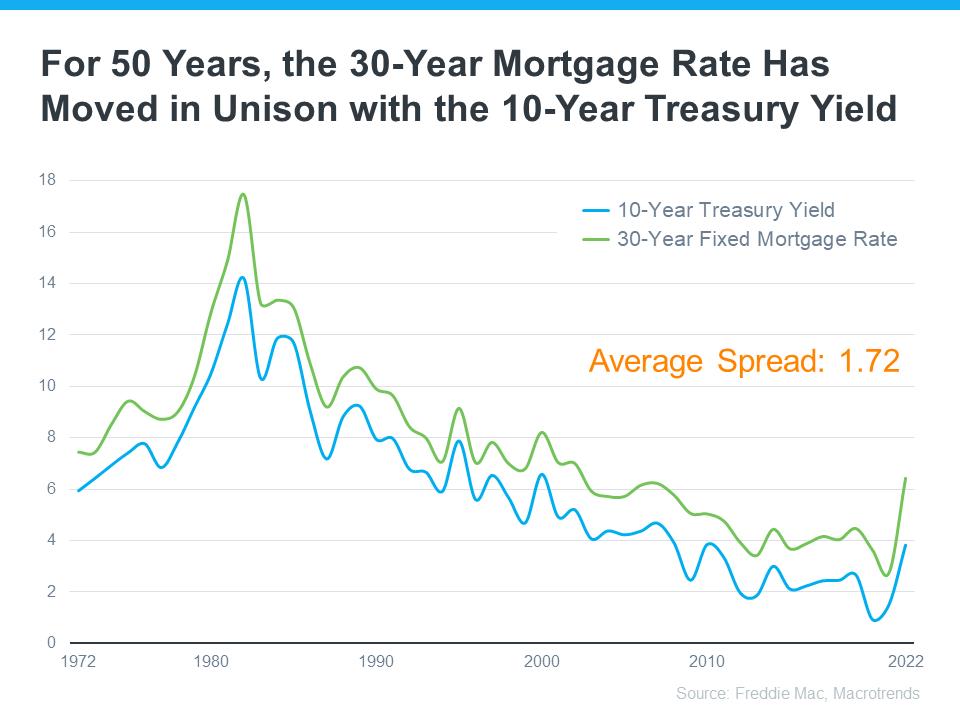 Historically, the spread between the 10-Year Treasury Yield and the 30-year fixed mortgage rate has been fairly consistent, but that’s not the case recently. That means, there’s room for mortgage rates to come down. So, keeping an eye on which way the treasury yield is trending can give experts an idea of where mortgage rates may head next. Here’s a graph showing those two metrics since Freddie Mac started keeping mortgage rate records in 1972:
