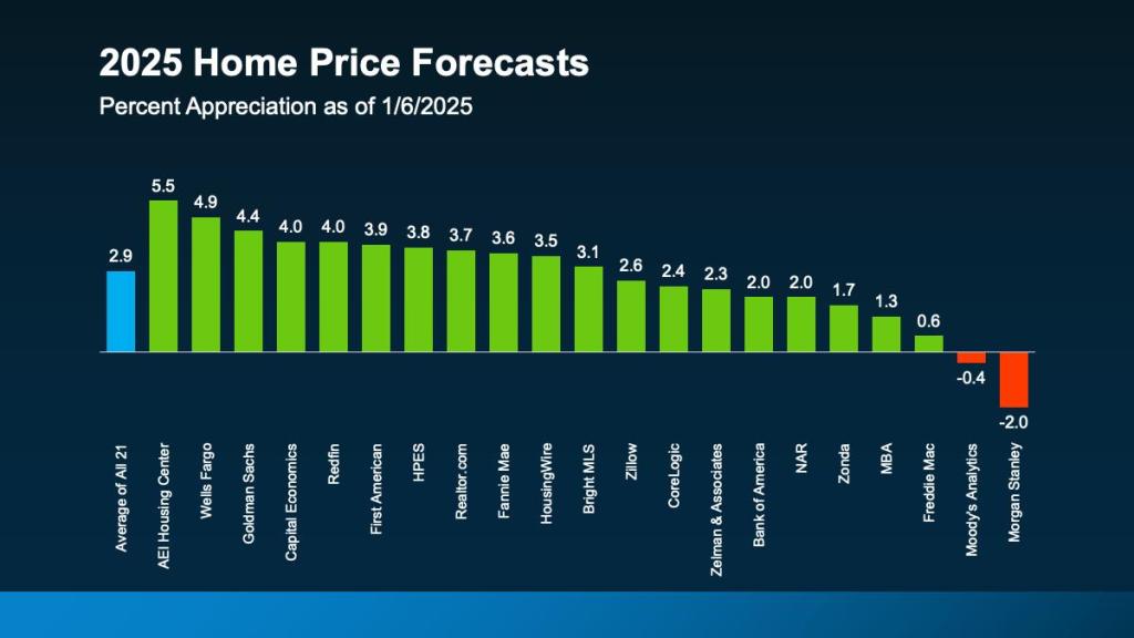 The short answer? Not likely. While mortgage rates are expected to ease, home prices are projected to keep climbing in most areas – just at a slower, more normal pace. If you average the expert forecasts together, you’ll see prices are expected to go up roughly 3% next year, with most of them hitting somewhere in the 3 to 4% range. And that’s a much more typical and sustainable rise in prices (see graph below):
