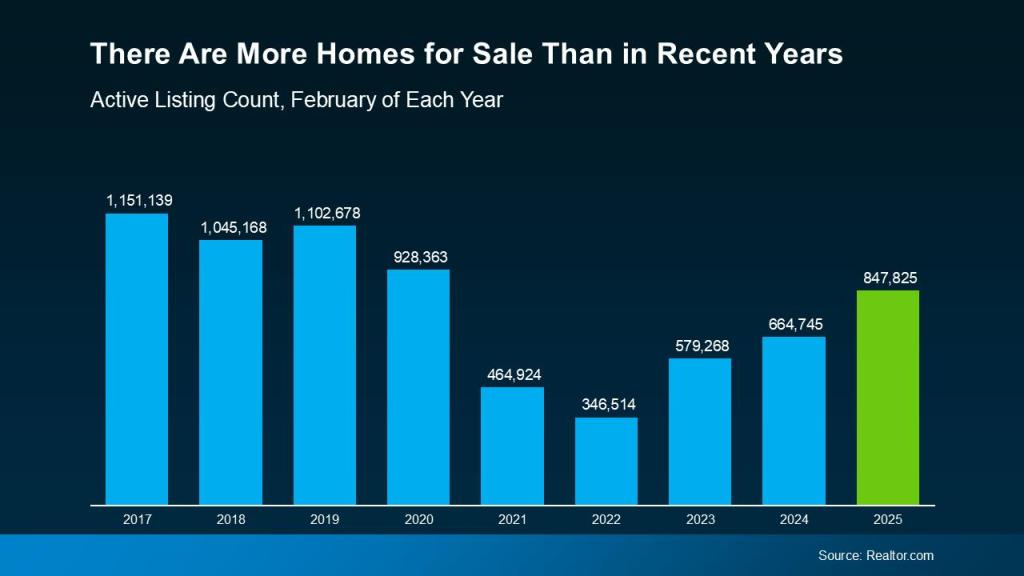 The number of homes for sale this February was higher than it’s been in any of the past five Februarys – and that’s great news for your home search. The graph below uses the latest data from Realtor.com to show the supply of homes on the market has grown by 27.5% in just the last year: