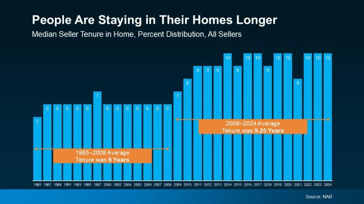 2. People Are Living in Their Homes Longer. Data from the National Association of Realtors (NAR), shows the average homeowner stays in their home for about 10 years now (see graph below):