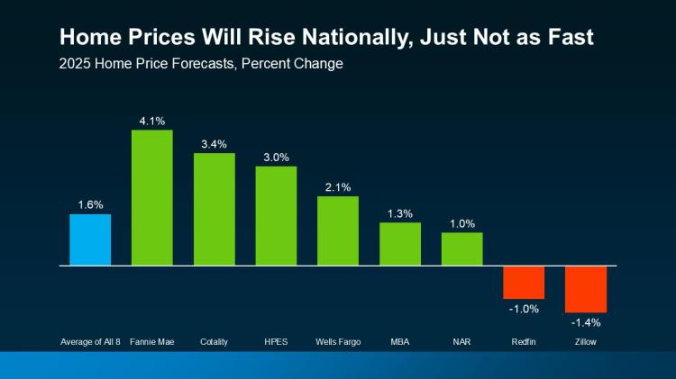 But experts say, even with that slowdown, prices will still rise this year at the national level. The average of 8 leading forecasters shows prices are expected to go up 1.5-2% in 2025 (see graph below):